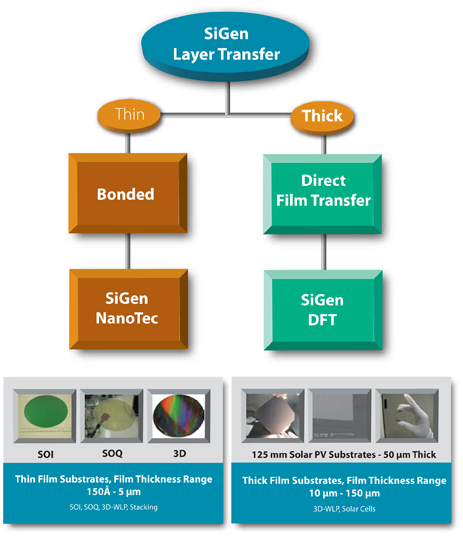 SiGen has developed a layer transfer regime called NanoTec™ thin film layer transfer. This patented layer transfer technology allows a very thin layer of material to be transferred to a "handle" wafer, resulting in an engineered substrate for advanced device applications. This is a low temperature process, which allows a wide variety of different materials to be successfully combined to form engineered substrates.